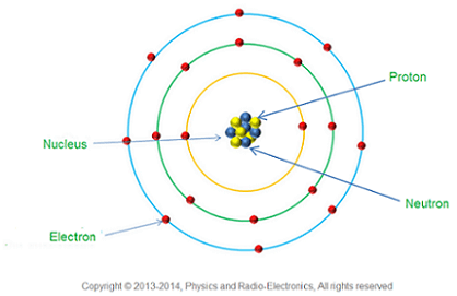 Atom je građen od jezgra i omotača. U jezgru se nalaze protoni i neutroni, a u omotaču elektroni. Protoni i neutroni se jednim imenom nazvaju nukleoni.