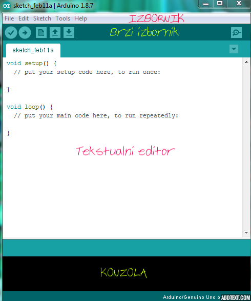 Izbornik nam osim standardnih File, Edit i Help izbornika nudi i dva specifična – Sketch i Tools. Sketch izbornik služi za podešavanje opcija korištenih knjižnica (library), i o tome ćemo nešto kasnije u lekciji Kako instalirati Arduino Library, a Tools izbornik, između ostalog, služi za odabir korištene Arduino pločice (Arduino UNO ili neke druge).