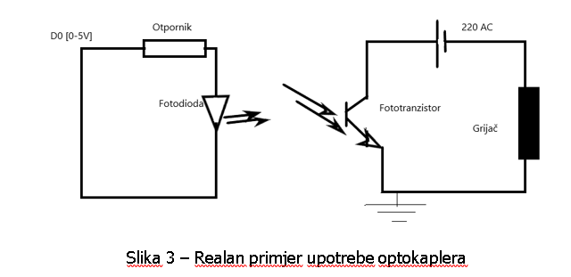Na ovaj način smo odvojili ulazni i izlazni električni krug. Izlazni krug je ovisan od stanja ulaznog kruga. Odnosno ukoliko fotodioda svijetli, prekidač u izlaznom krugu će biti u stanju ON i zatvorit će se električni izlazni krug. Inače izlazni krug je otvoren i tu nema dešavanja.