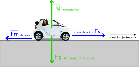 – u vertikalnom pravcu automobil se ne pomjera, tako da rezultanta vertikalnih sila mora biti jednaka nuli. Tako dobijamo