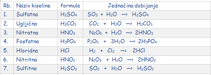 Najpoznatije kiseline i njihovo dobijanje prikazaćemo u tabeli :