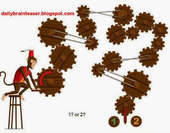 Majmun će uskoro zarotirati zupčanik prema dole / suprotno od kazaljke na satu (kao na slici). Koji broj (1 ili 2) će olovka prikačena na zadnji zupčanik udariti?
